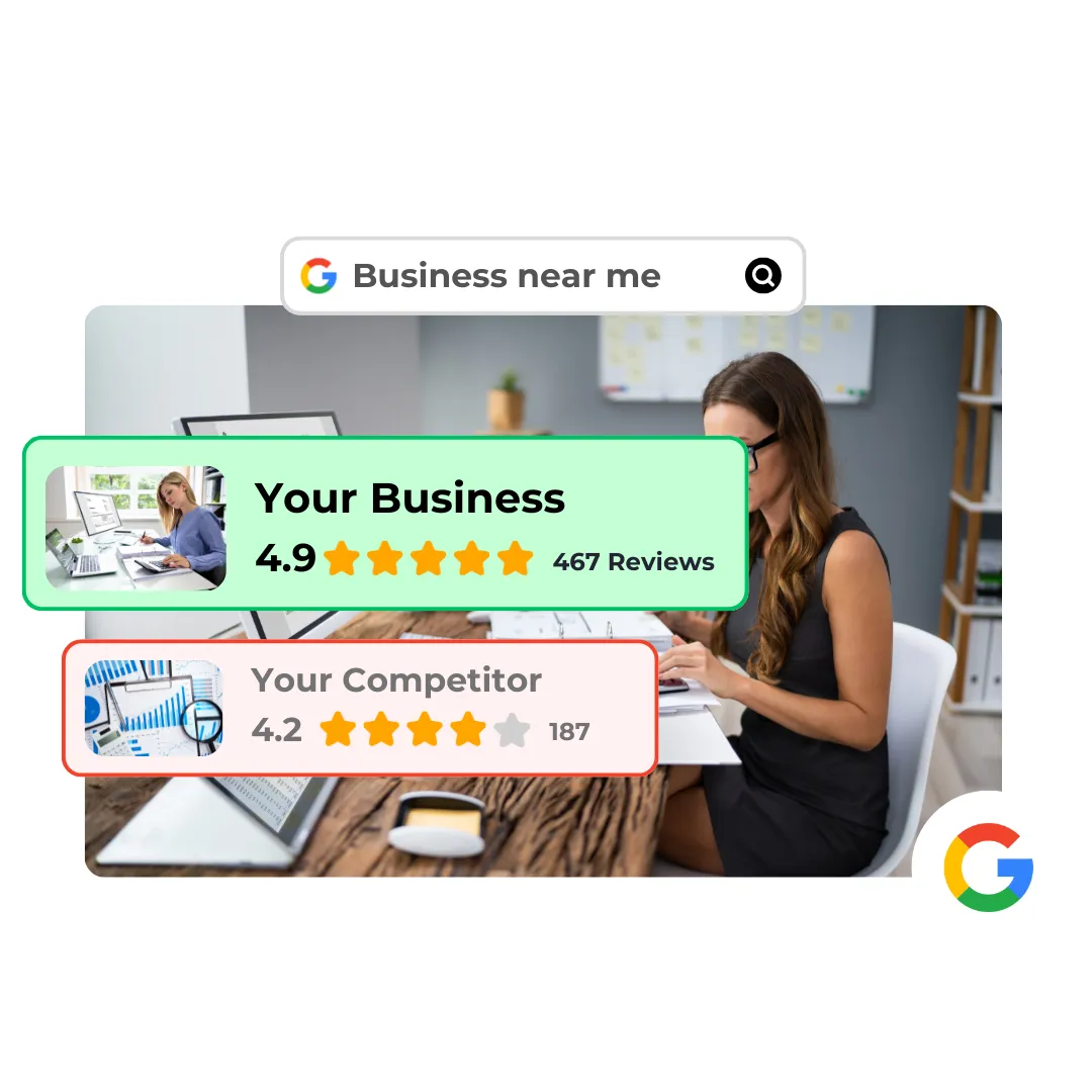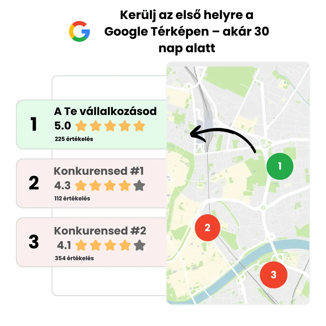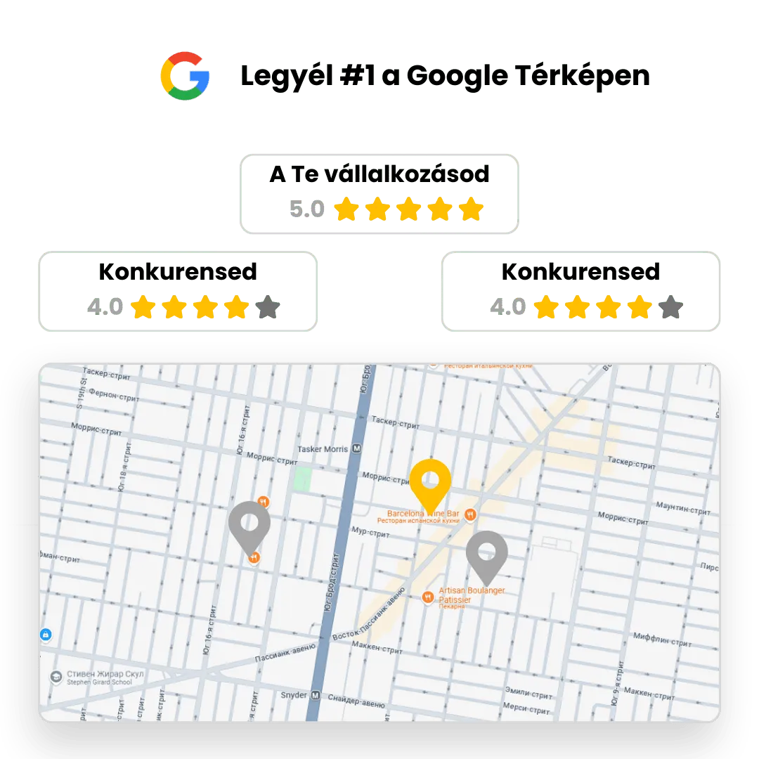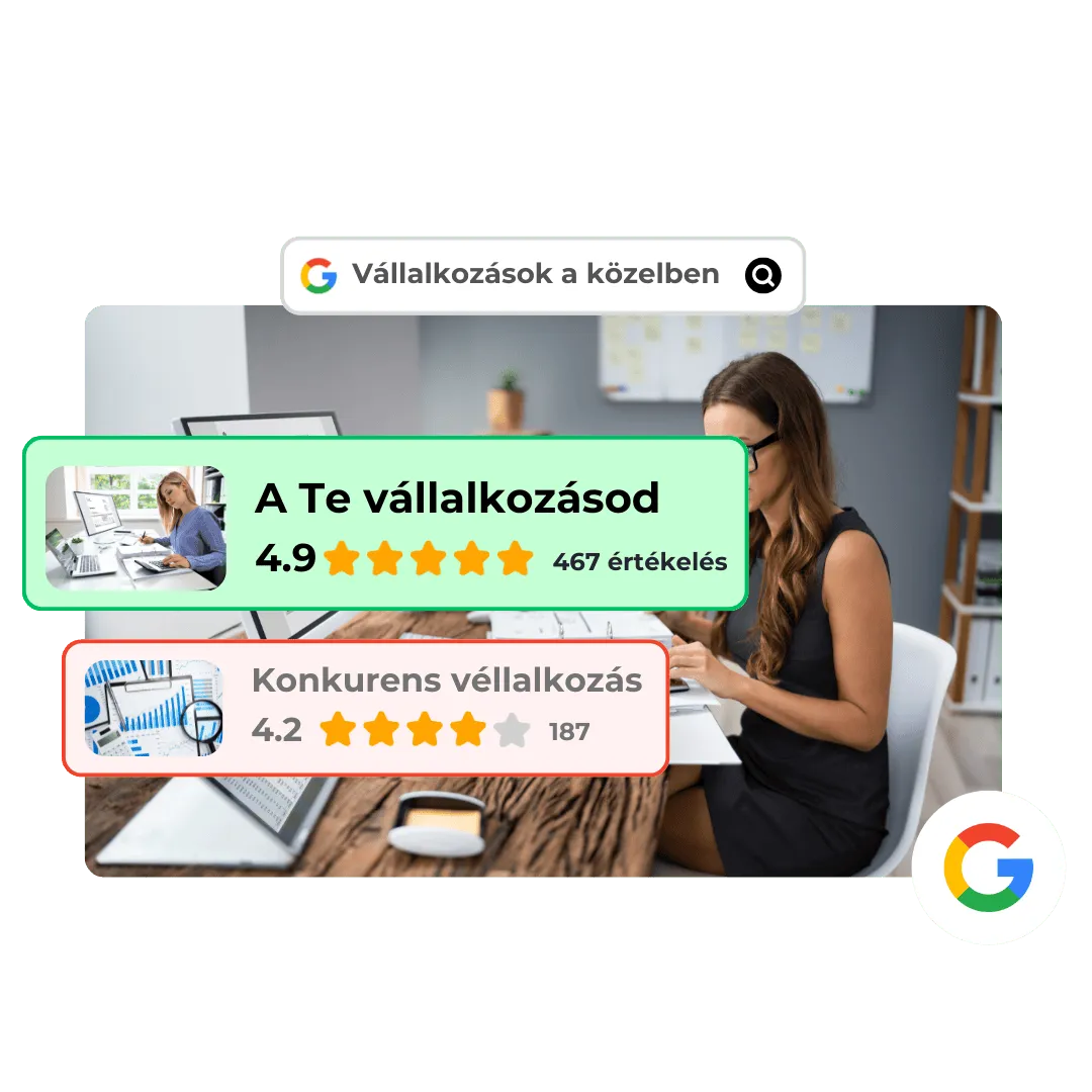 A Google-értékelések javítják az online hírnevedet, növelik a láthatóságodat a keresési találatokban, erősítik a bizalmat a potenciális ügyfelekben, és több forgalmat valamint bevételt hoznak a vállalkozásodnak.